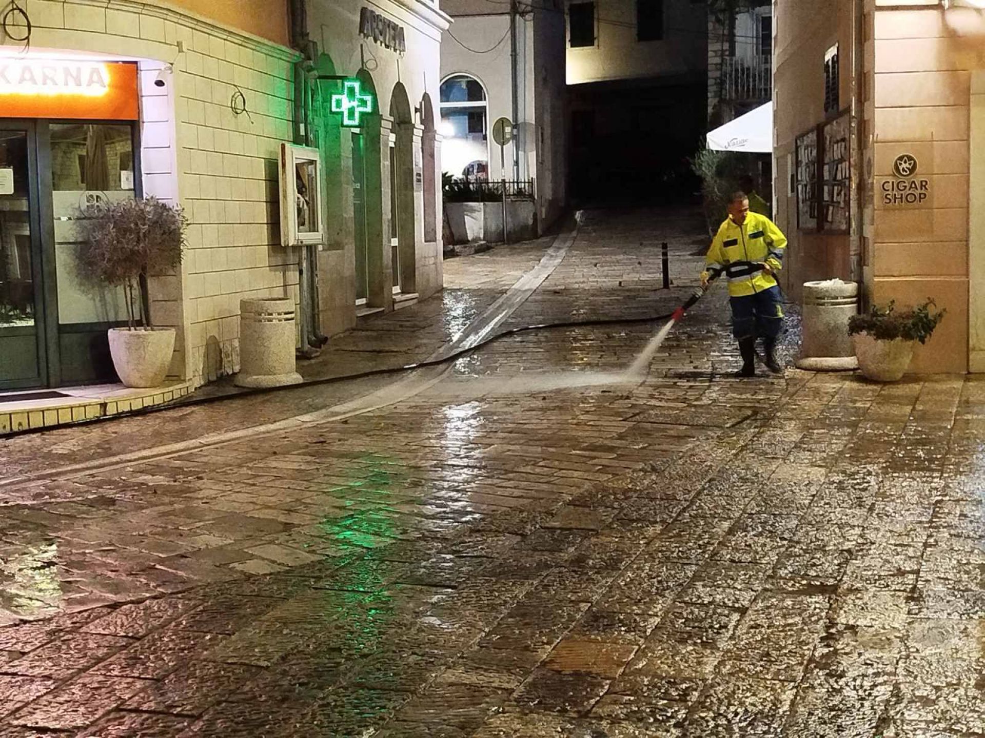 Jutarnje aktivnosti pranja na više lokacija. Pranje duž ulice Marka Cara i trga Mića Pavlovića, kao i trajektnog pristaništa i duž donjeg puta kroz Bijelu. (avgust, 2025.g.).