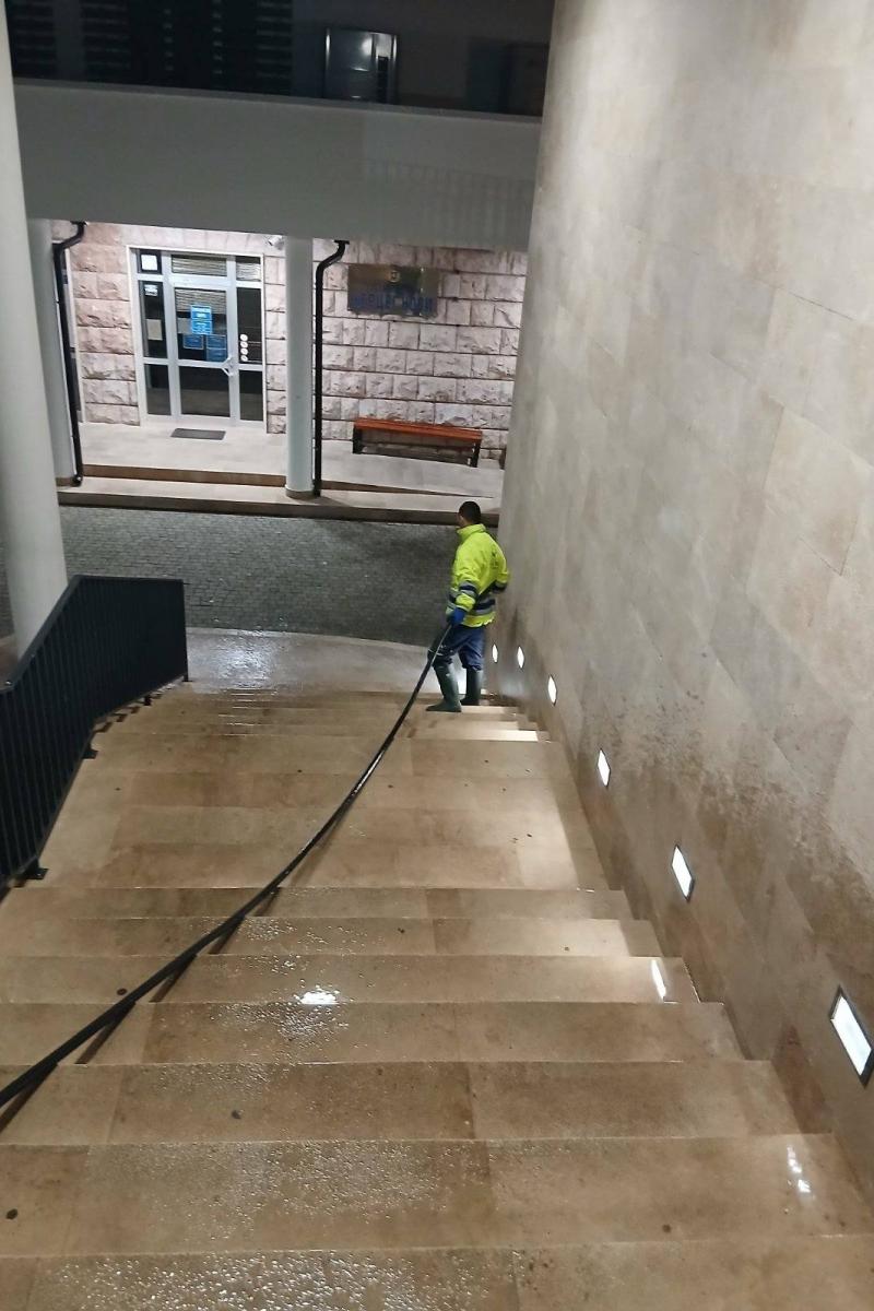 Jutarnje pranje trga Nikole Đurkovića i okolnih stepeništa (decembar, 2025.g.).